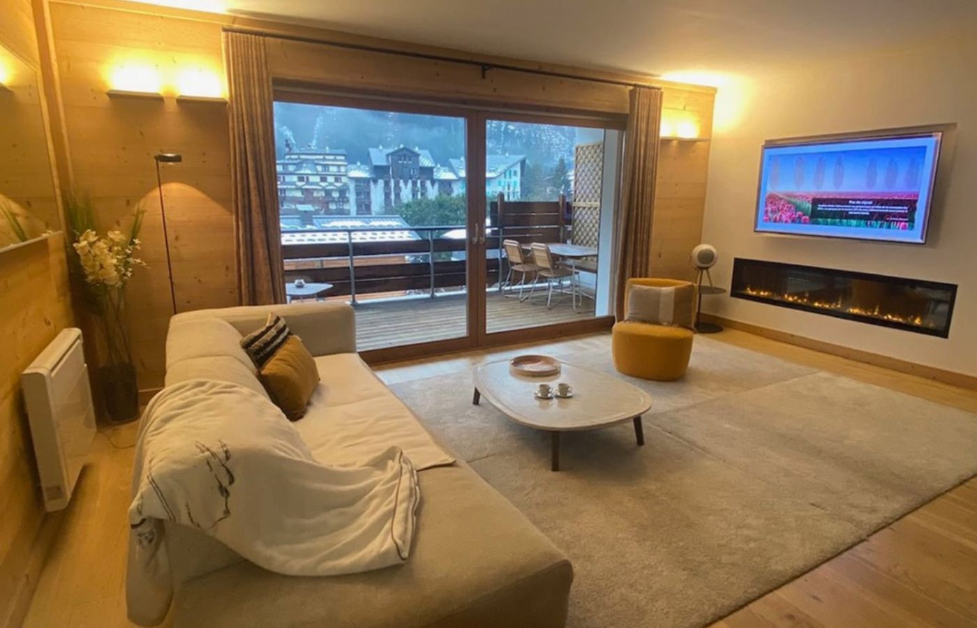 The living room is open, modern and chic with its fully equipped kitchen, its dining area which can comfortably accommodate 8 people, its lounge with chaise longue, armchair, plasma screen and heated electric fireplace, all with a bay window with pocket giving light and access to the 18 m2 terrace overlooking Mont-Blanc, very quiet.