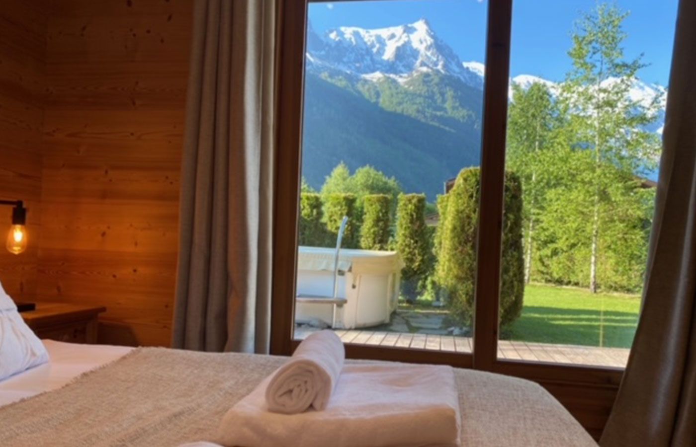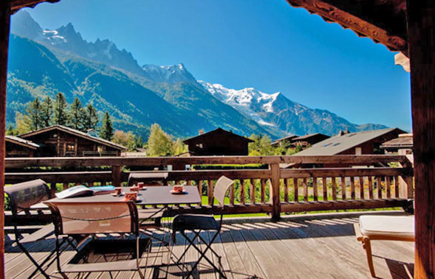 Grande terrasse exposée sud, bénéficiant d’une vue panoramique à 180° sur toute la chaîne du Mont-Blanc : Aiguille du Midi, Mont-Blanc, les Drus, La Flégère, Le Brévent, avec table chaises, parasol transat et plancha.