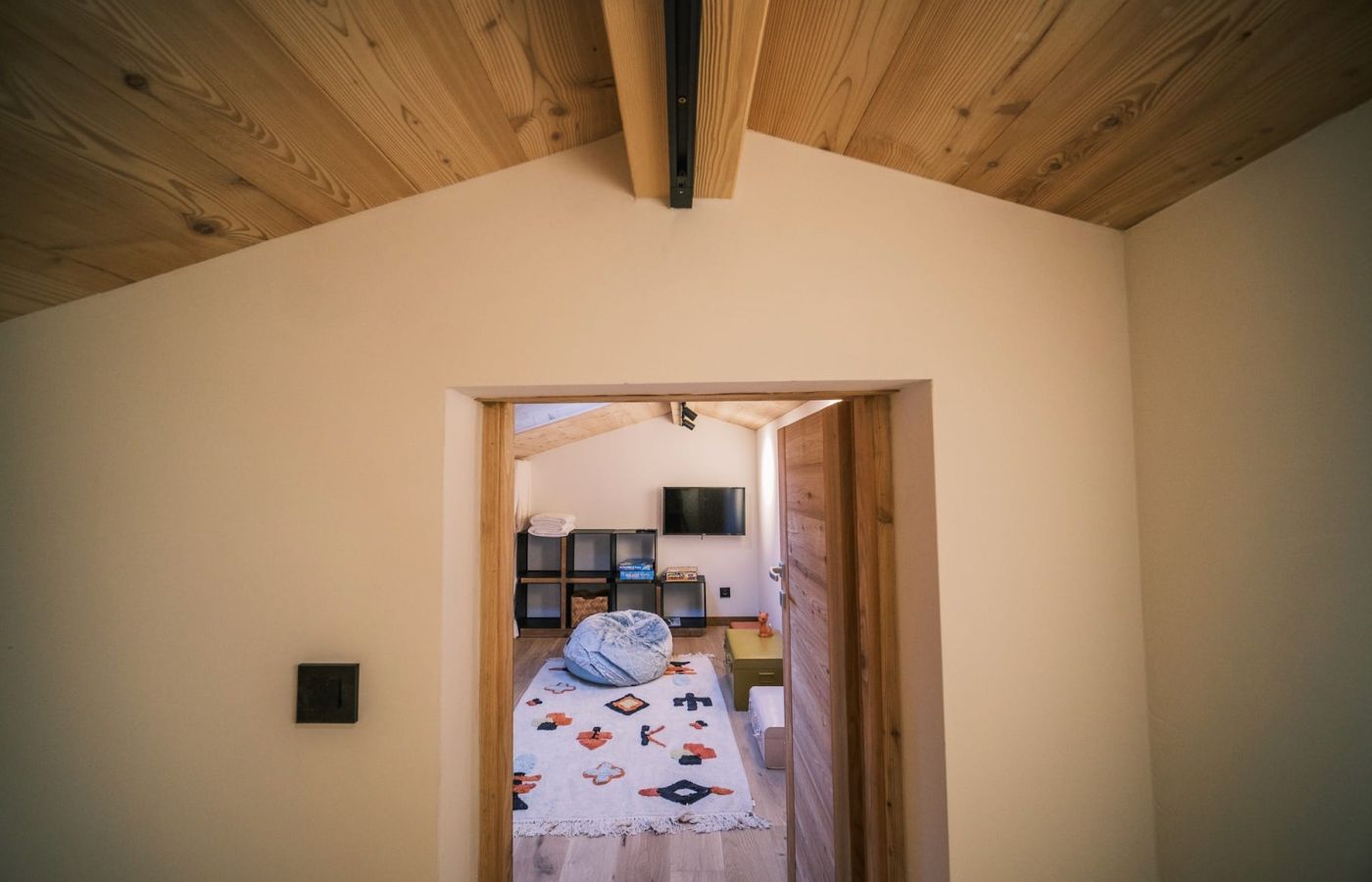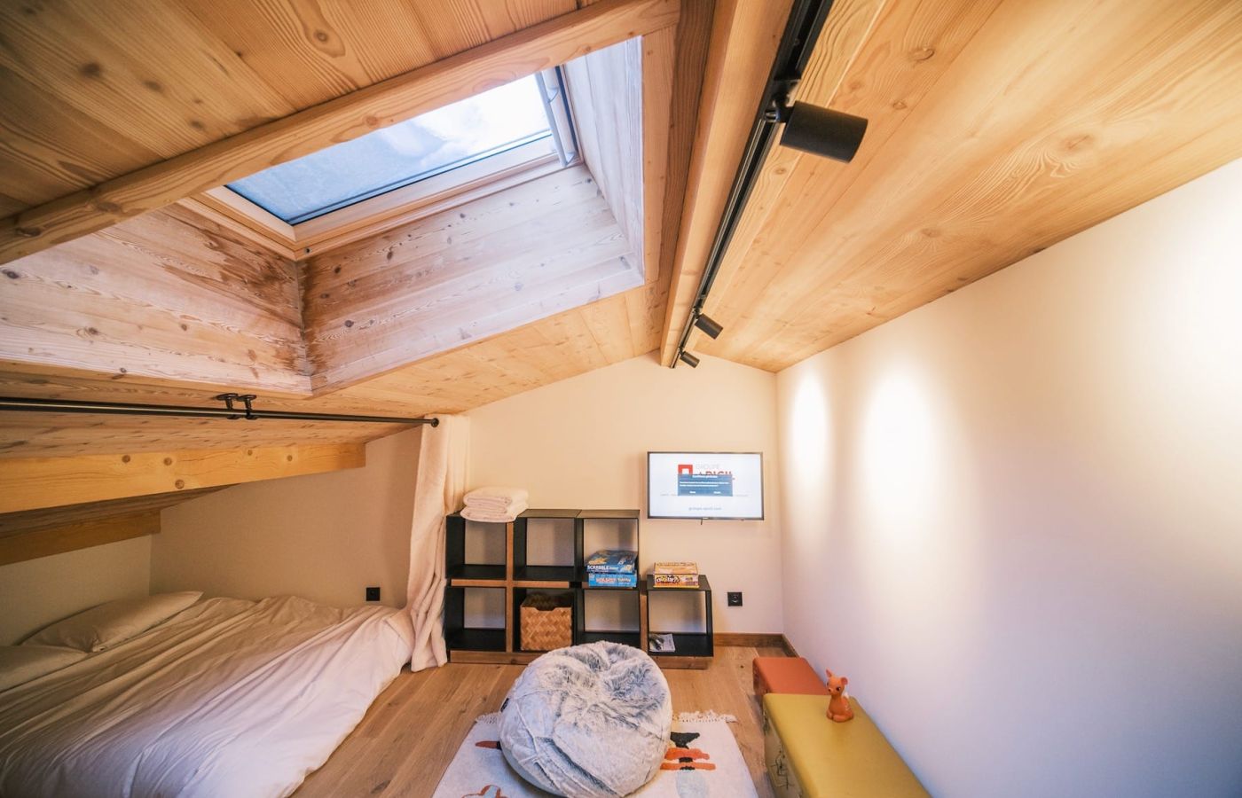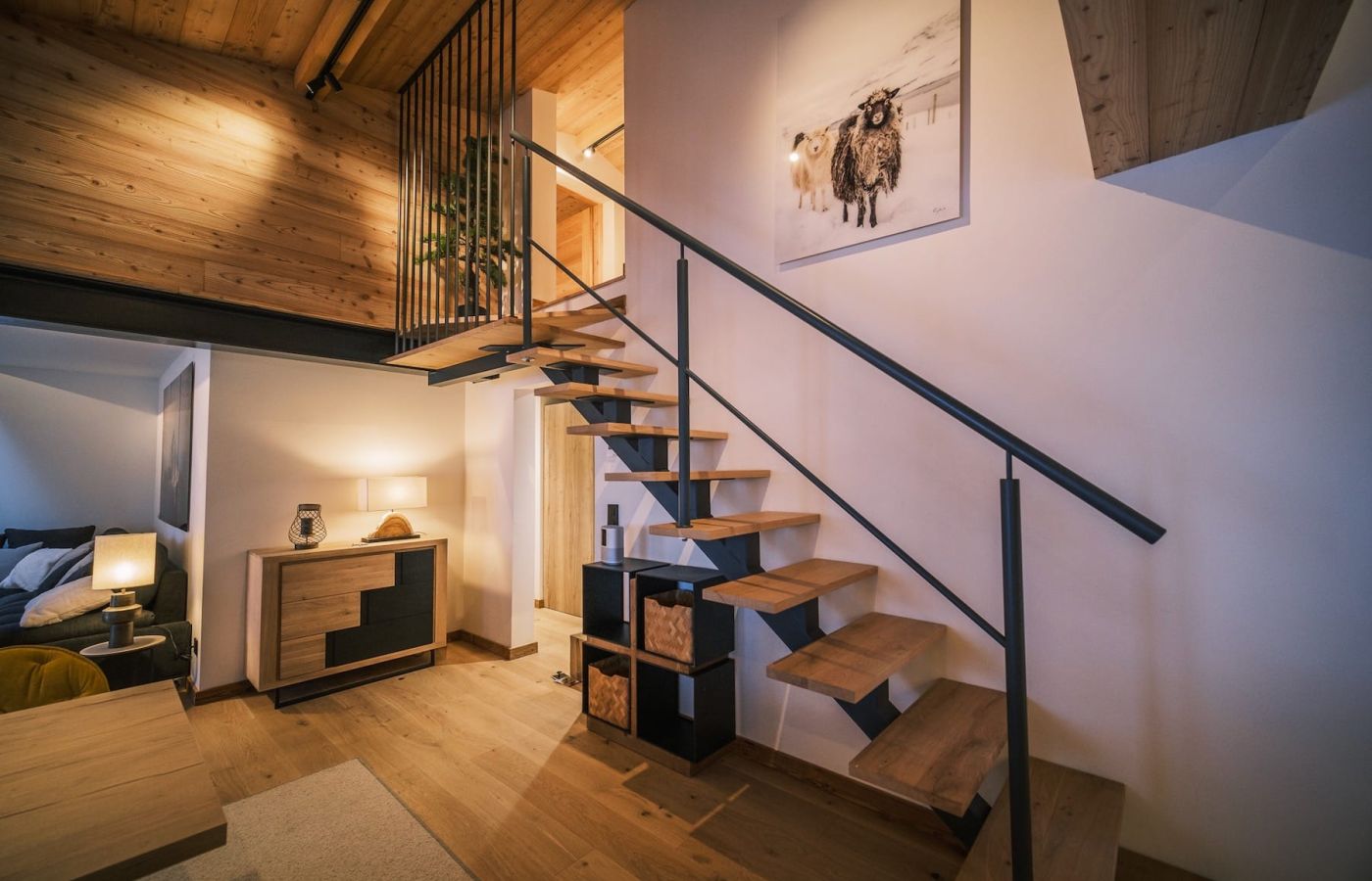 En mezzanine, 2 couchages simples d’un côté et de l’autre couchage double ou enfants ou amis visiteurs apprécieront l’ambiance refuge.