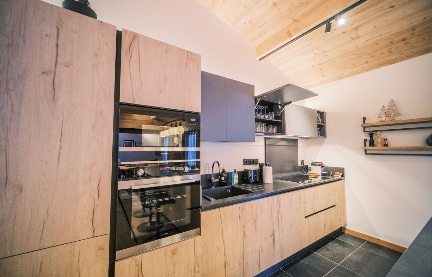 Cuisine moderne entièrement équipée ouverte sur l’espace repas et le salon avec canapé d’angle et TV.