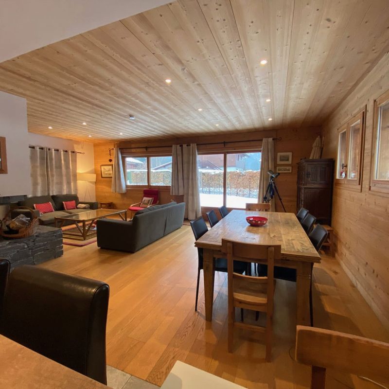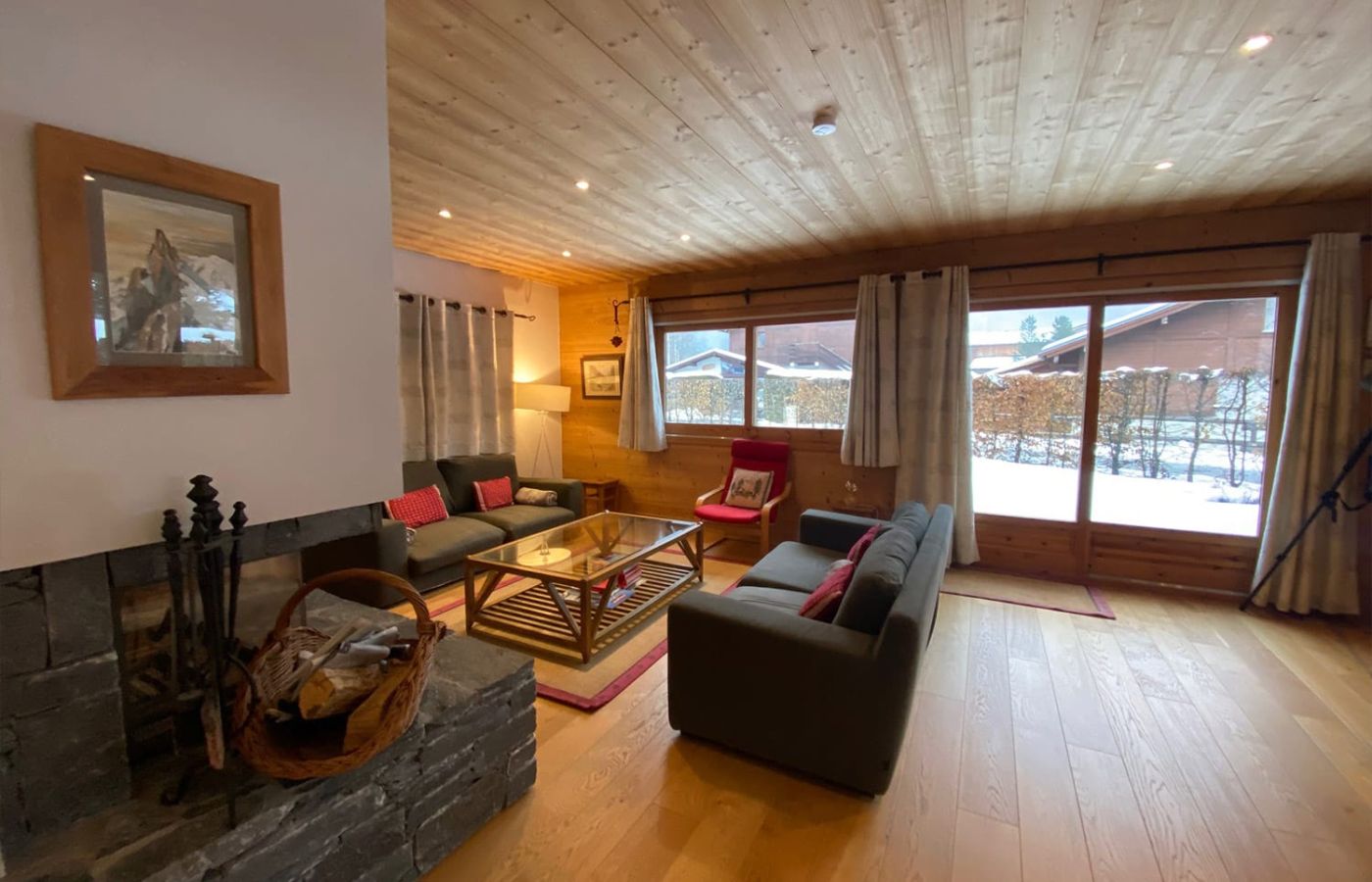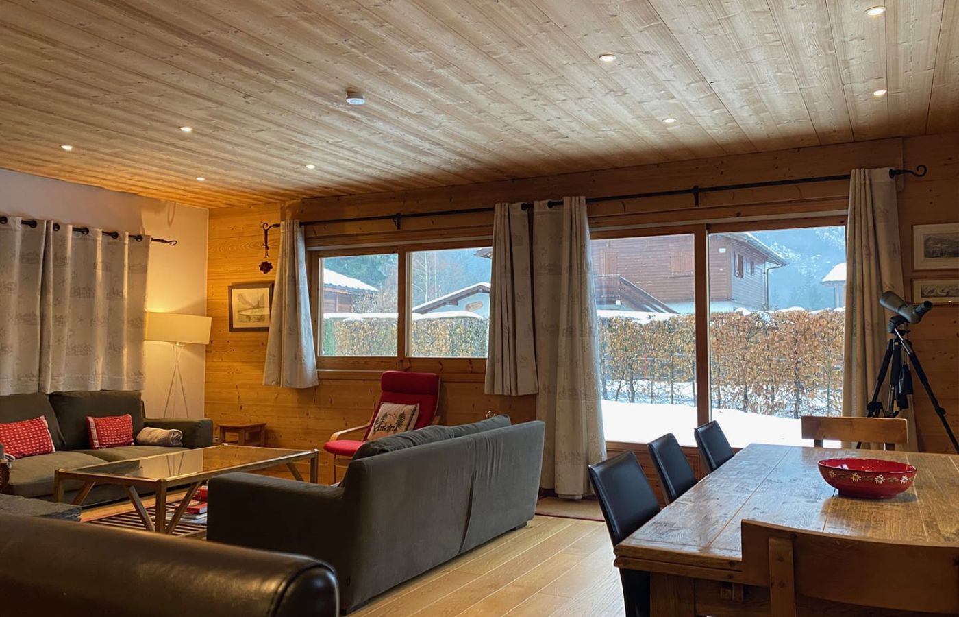 Il y a de belles ouvertures aussi vers l’extérieur et donc sur la terrasse et le petit jardin, vue sur le Mont-Blanc, les Drus, le Brévent.