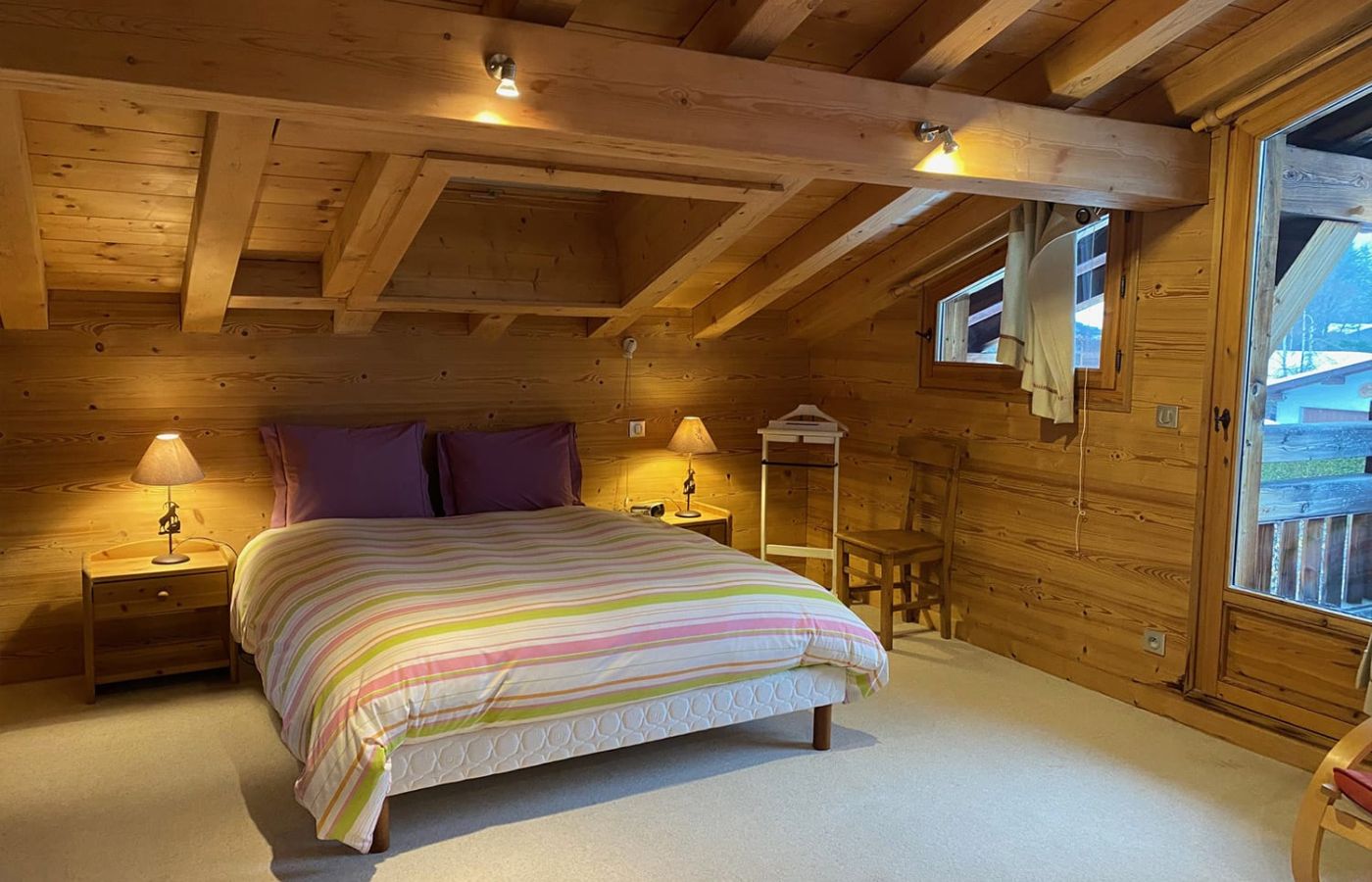 Au premier sous la belle charpente se situe l’espace nuit pour 6 personnes, avec des découpes de poutres nous faisant penser au refuge de montagne :
