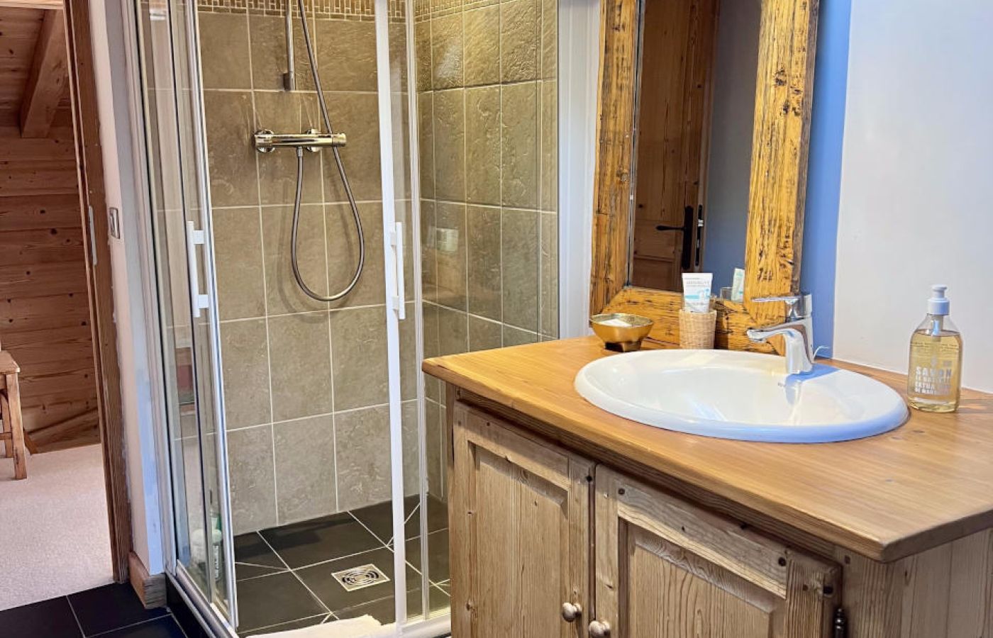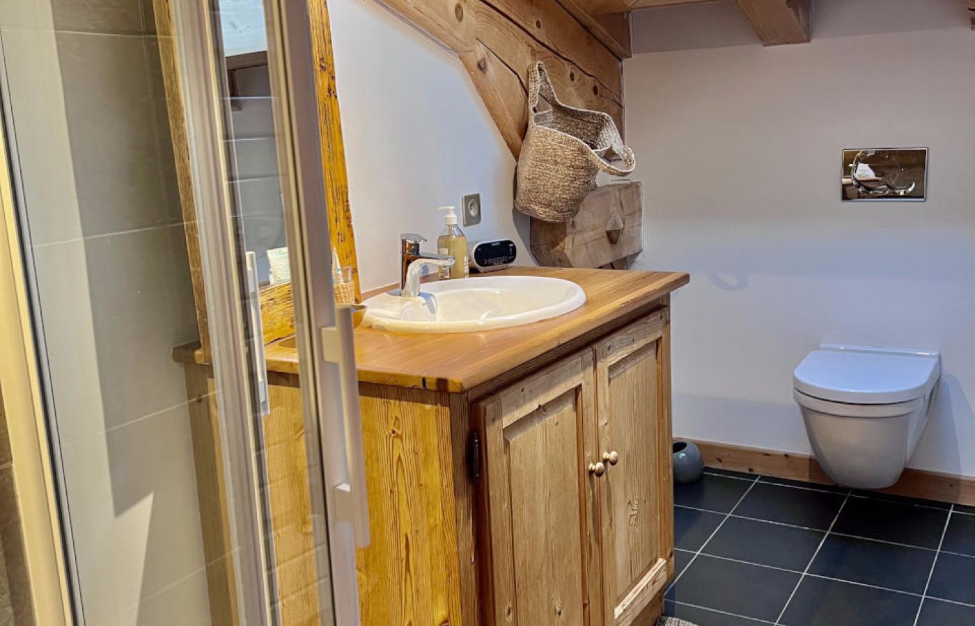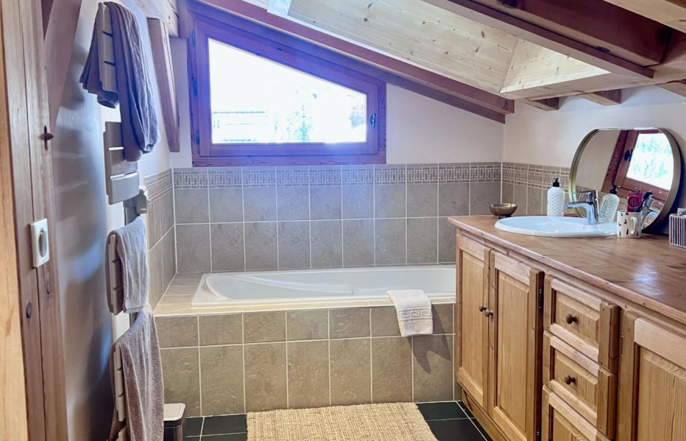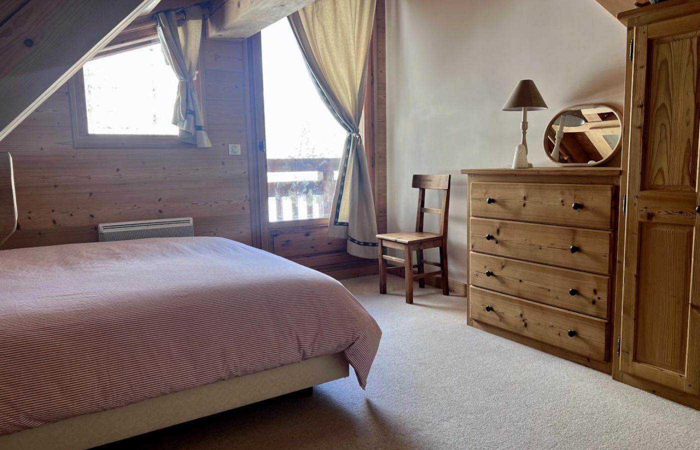 – 1 chambre parentale, exposition sud, vue sur la chaîne du Mont-Blanc, avec balcon, en suite avec bain, WC, et douche.