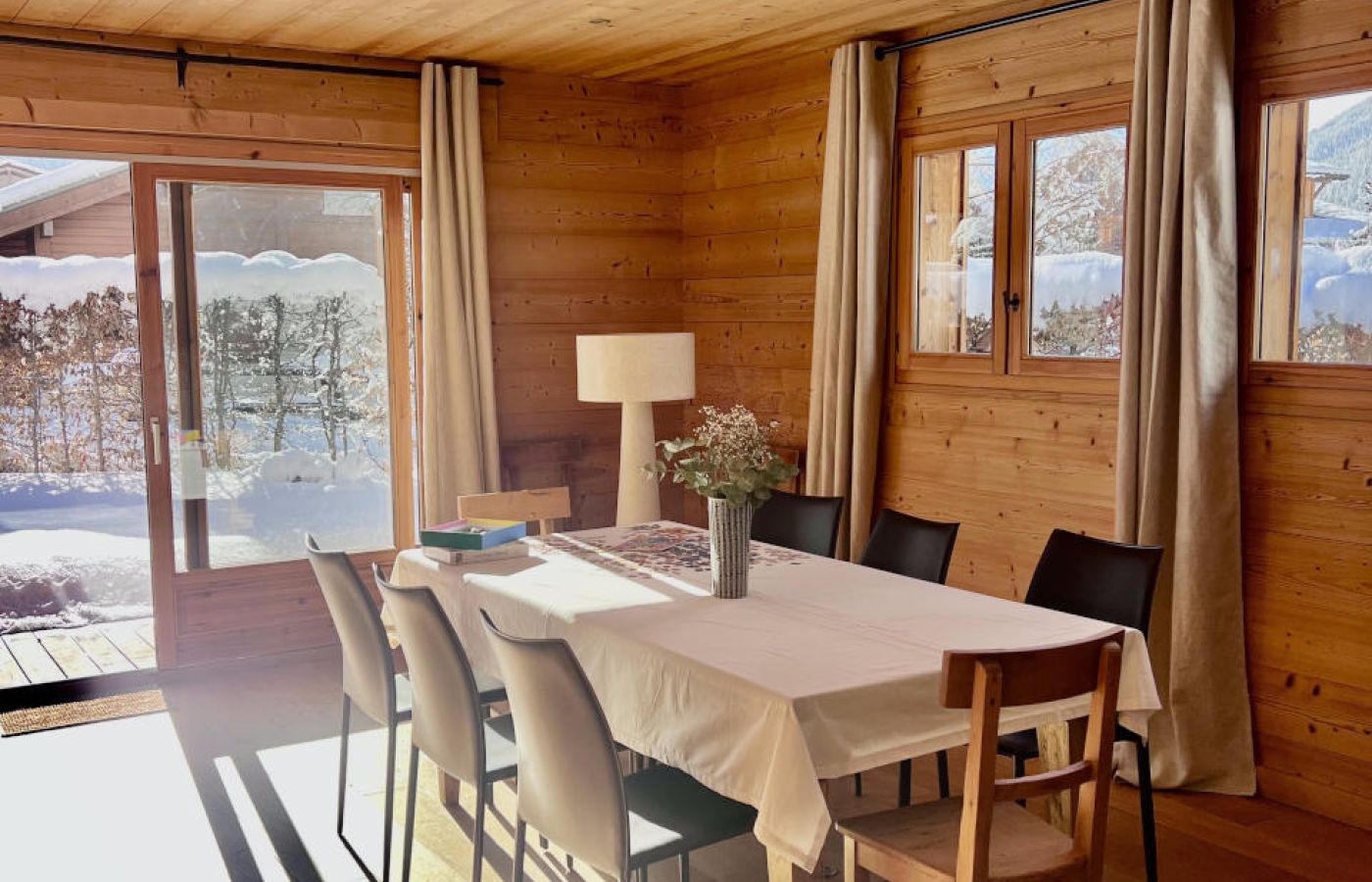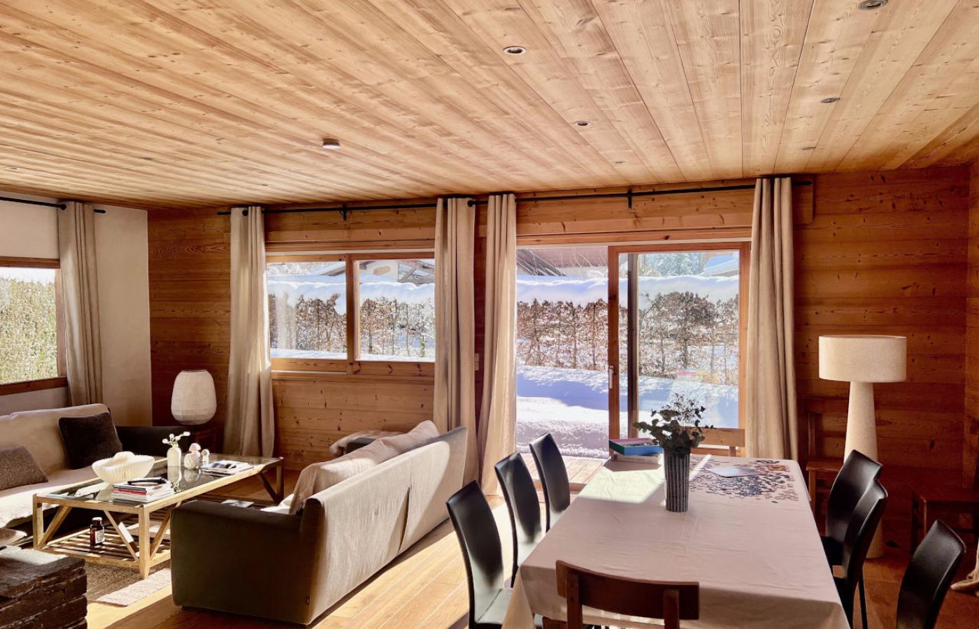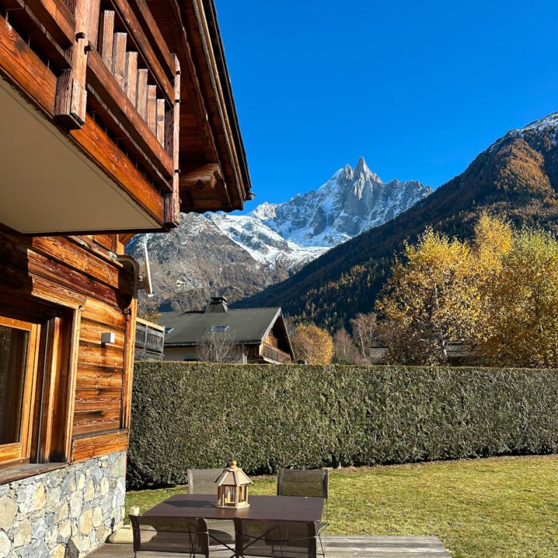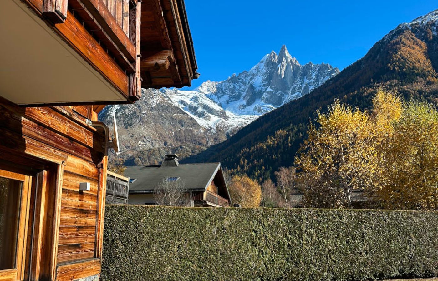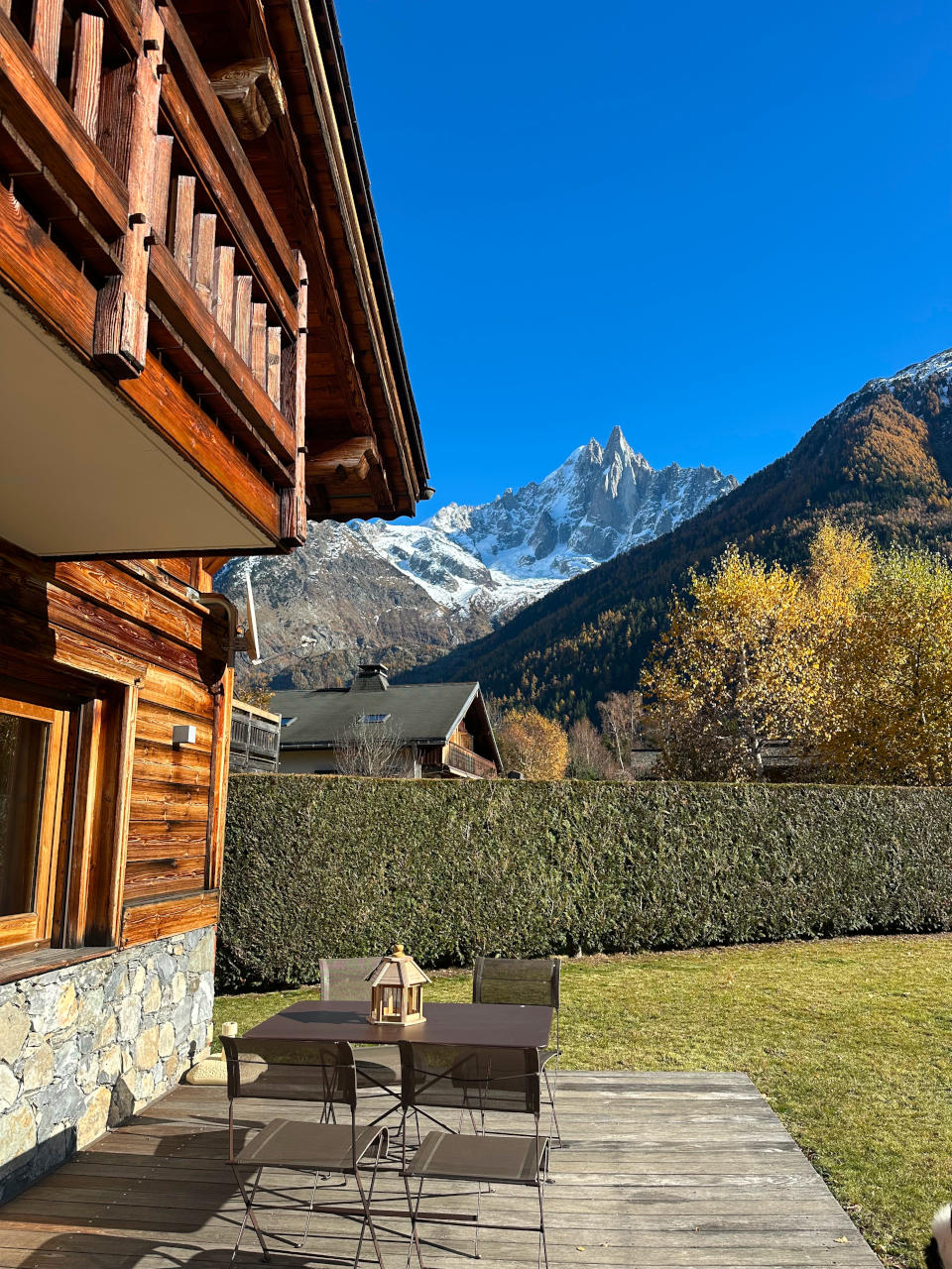 Il y a de belles ouvertures aussi vers l’extérieur et donc sur la terrasse et le petit jardin, vue sur le Mont-Blanc, les Drus, le Brévent.