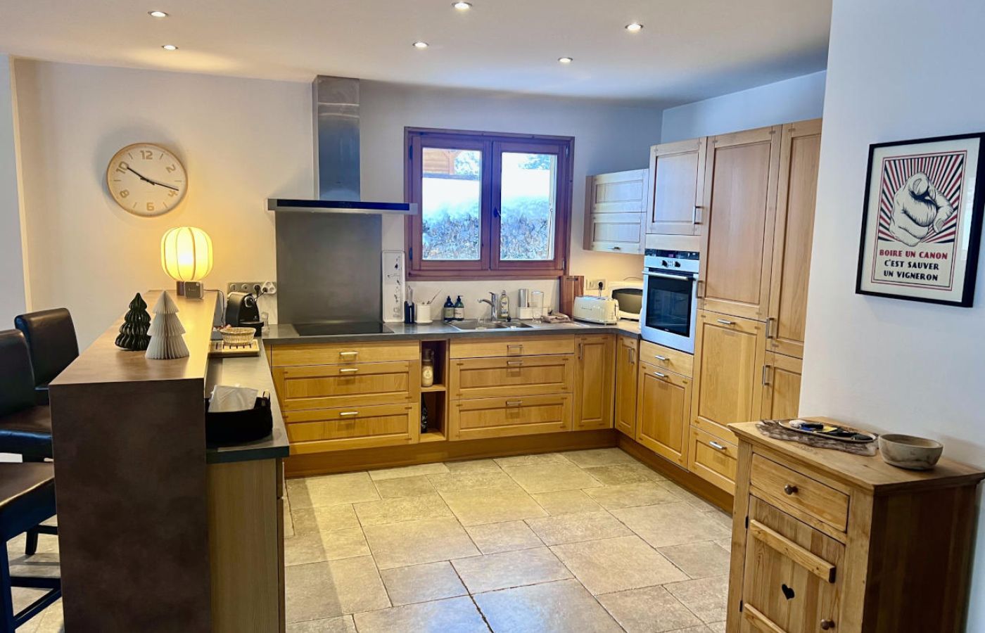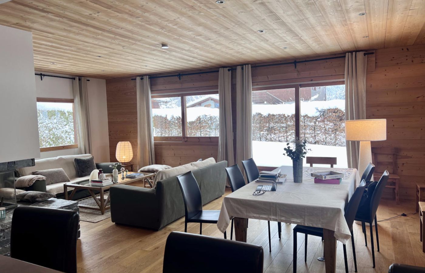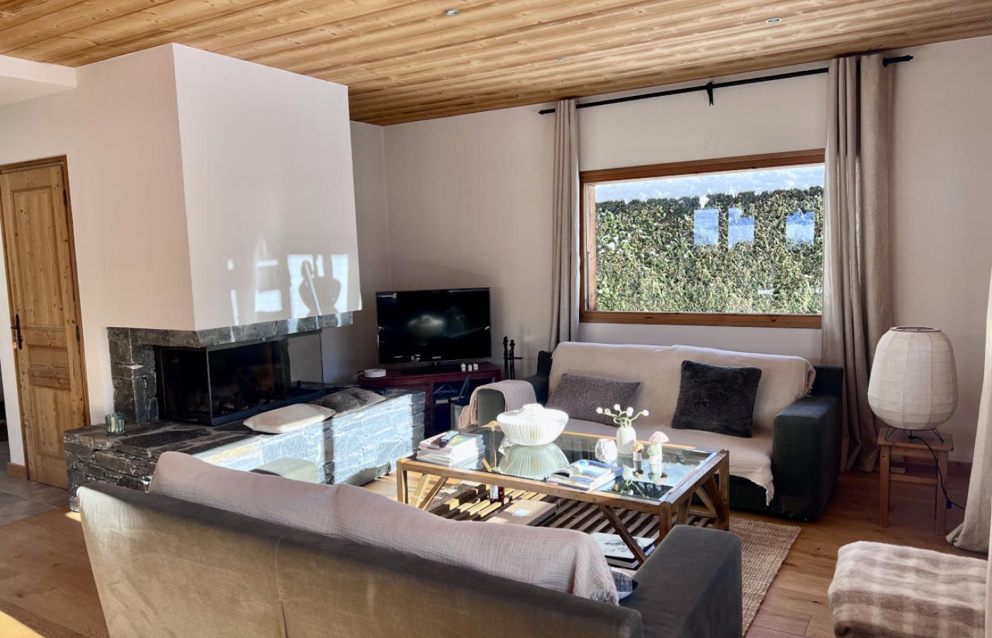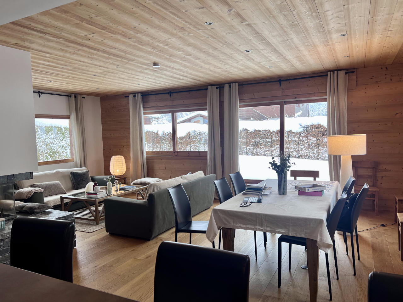 Il y a de belles ouvertures aussi vers l’extérieur et donc sur la terrasse et le petit jardin, vue sur le Mont-Blanc, les Drus, le Brévent.