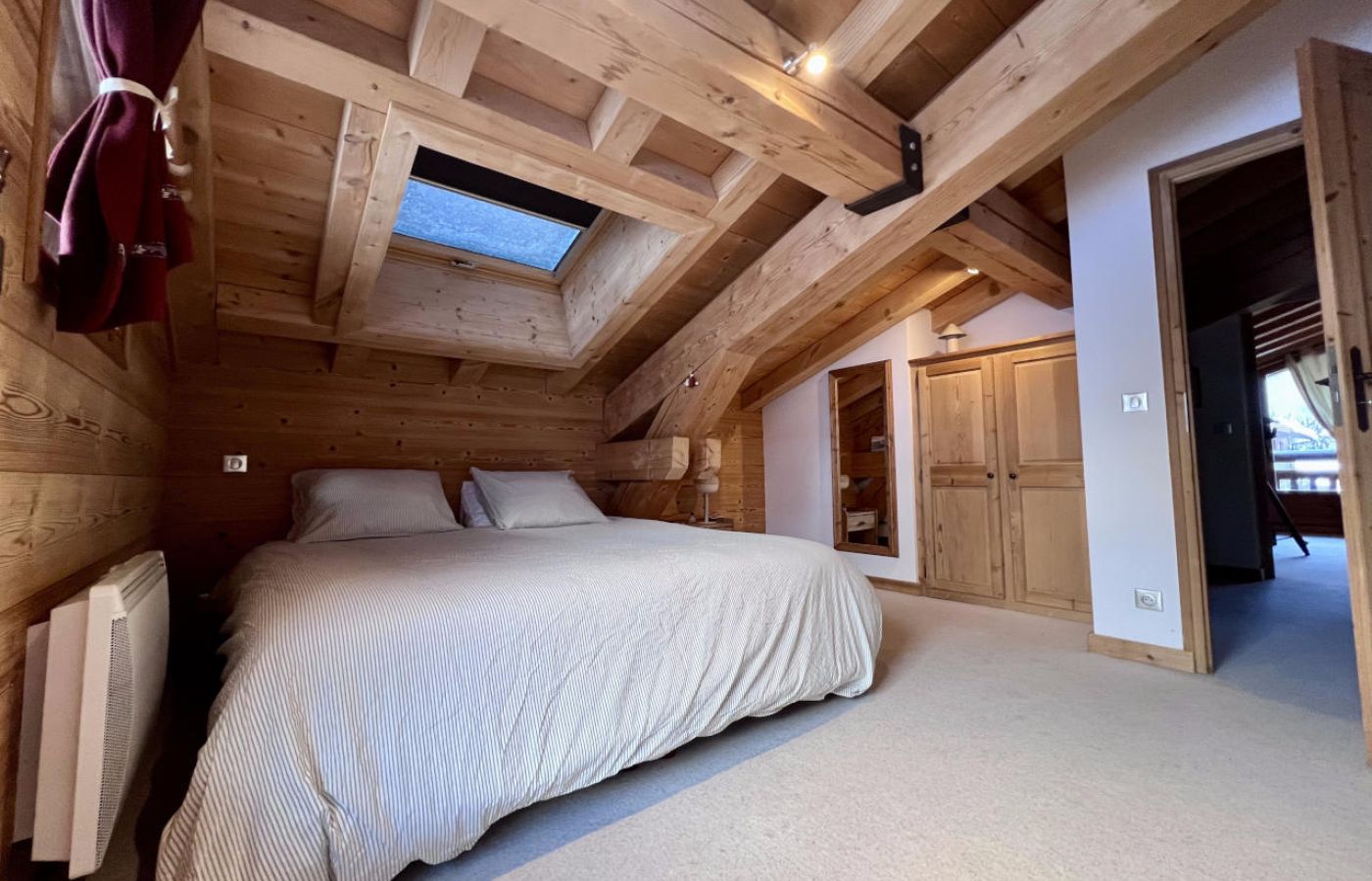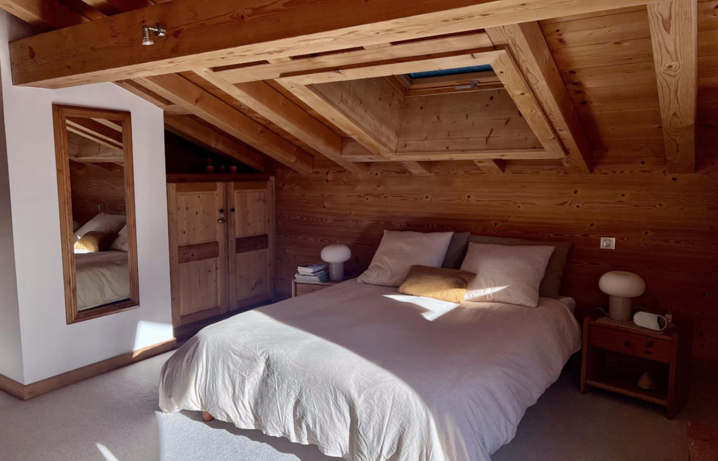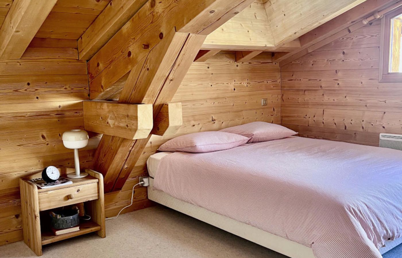 Au premier sous la belle charpente se situe l’espace nuit pour 6 personnes, avec des découpes de poutres nous faisant penser au refuge de montagne :