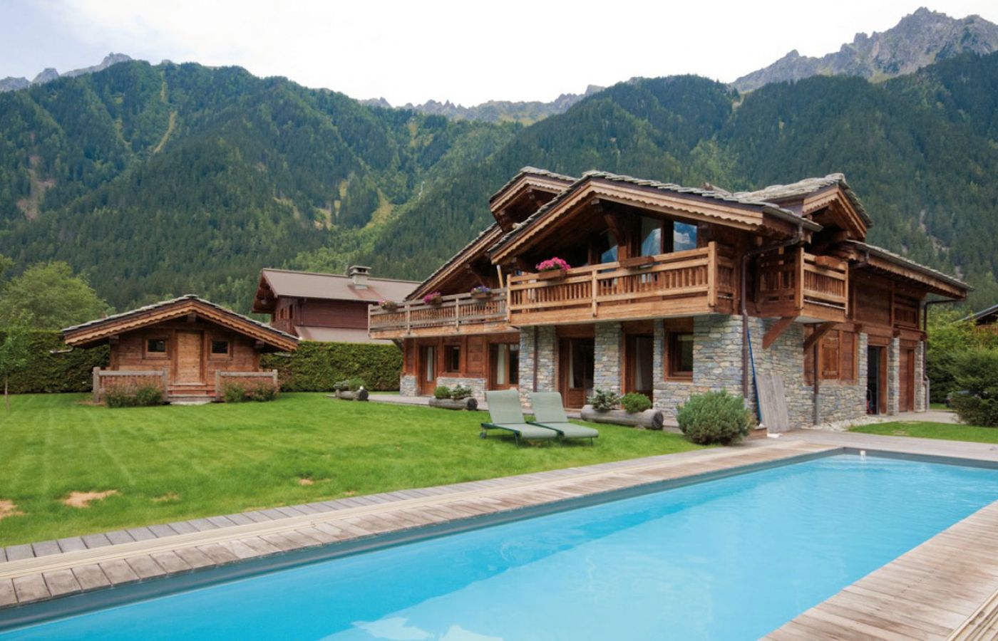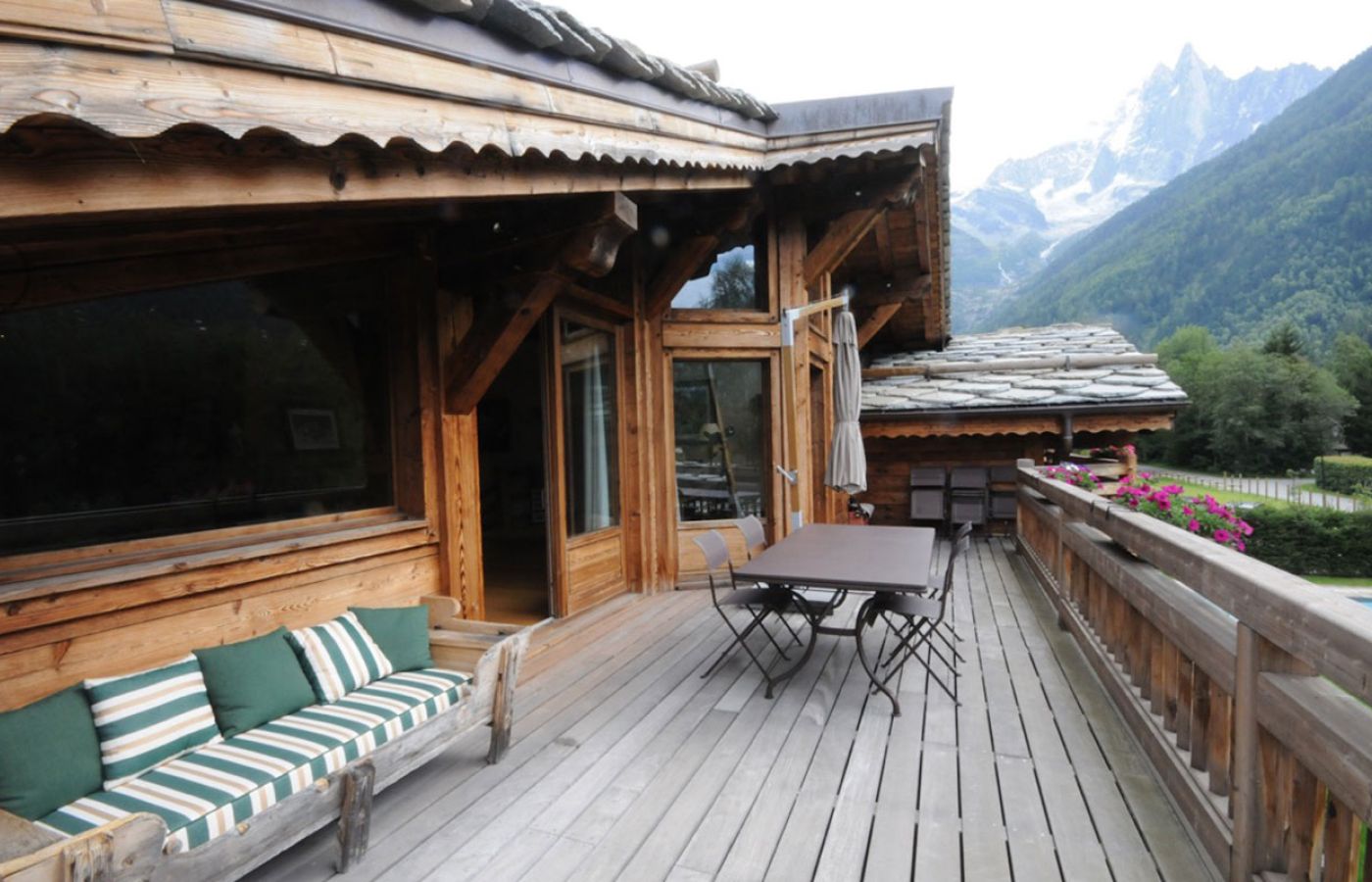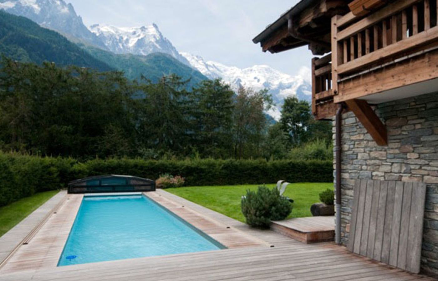 Extérieur : 2 terrasses, l’une vue Mont-Blanc, l’autre vue sur les Drus, jardin privé, piscine extérieure (liner et couverture neufs- été 2020).