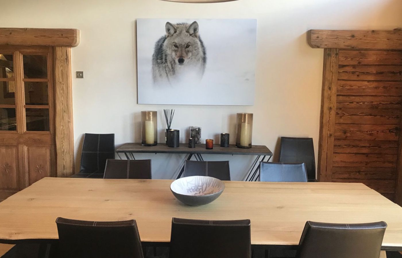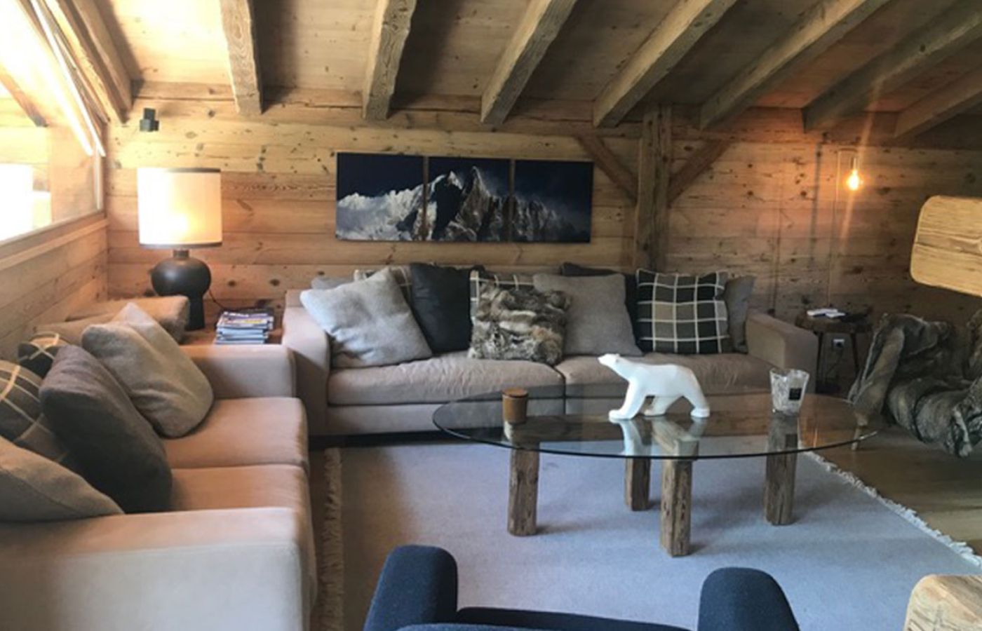 La pièce à vivre se situe également au premier sous la charpente, offrant de grandes baies vitrées, avec pour séparation du coin repas et du coin salon, une immense cheminée centrale, le tout ouvert sur une belle terrasse face à la chaine du Mont-Blanc.
