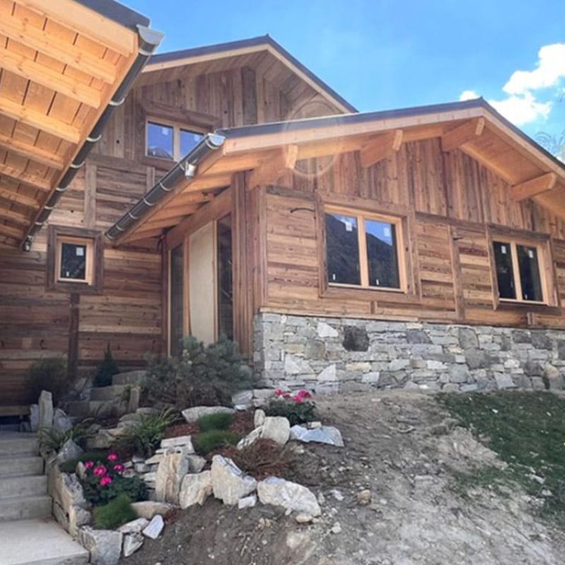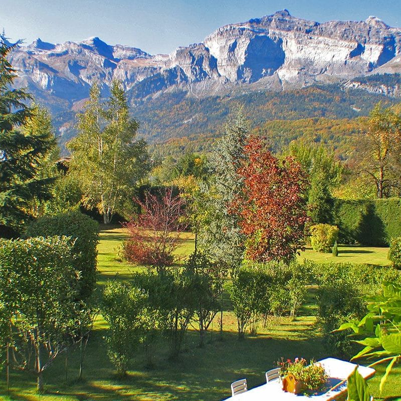Commune Les Houches, exposé sud, vue sur le Dôme du Goûter et les Fiz ainsi que sur une vieille ferme de pays, paysagé d’une haie de Tuyas de plus de 25 ans.